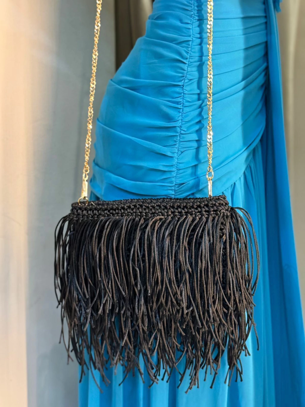 Produzida artesanalmente em crochê com fios acetinados, fecho interno de imã e alça dourada.