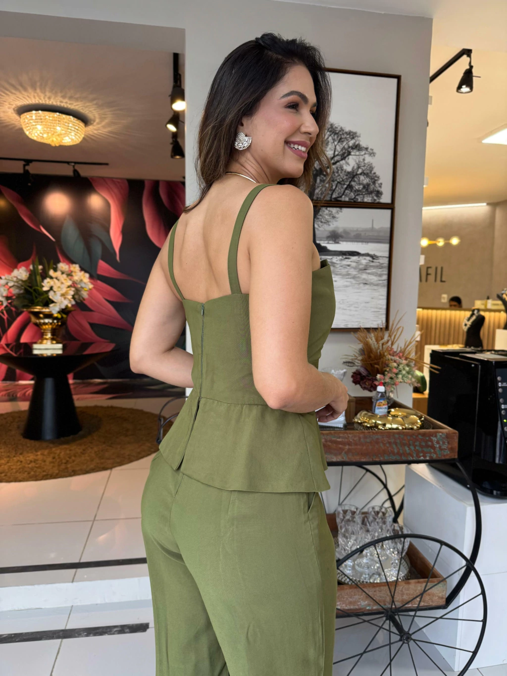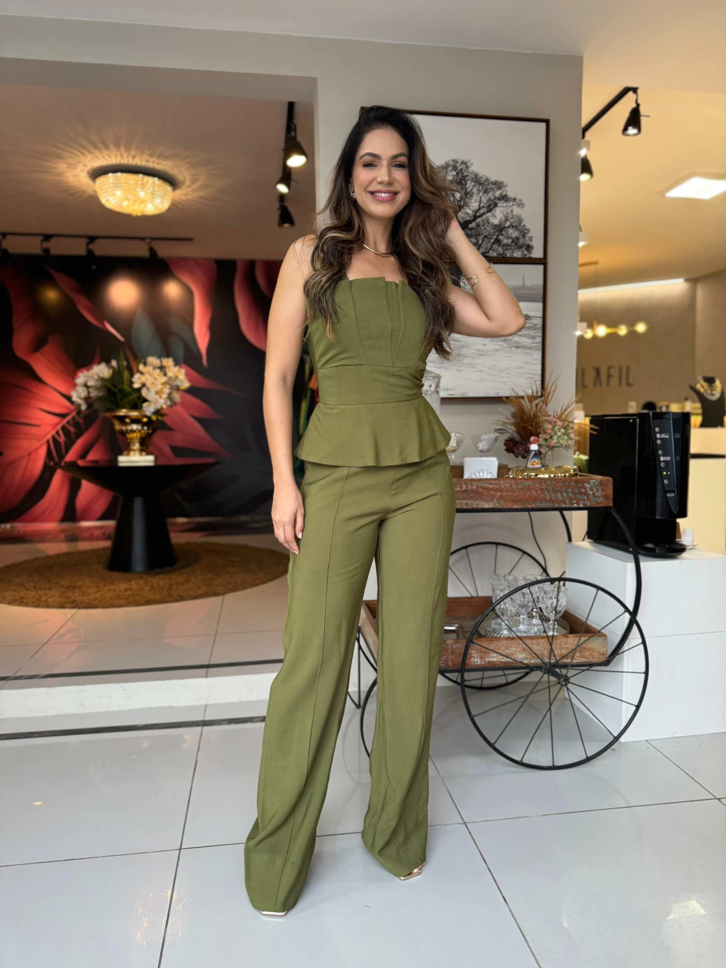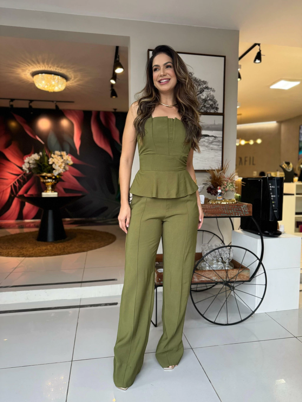 Macacão pantalona composto por blusa de decote tomara que caia com aplicação de alças, detalhes de dobraduras frontais e barra em peplum, que valoriza a cintura com leve volume.