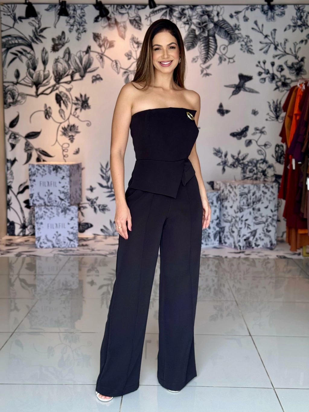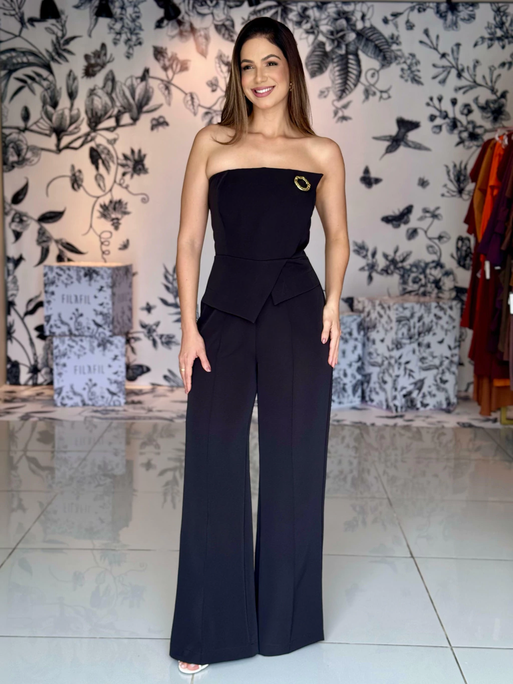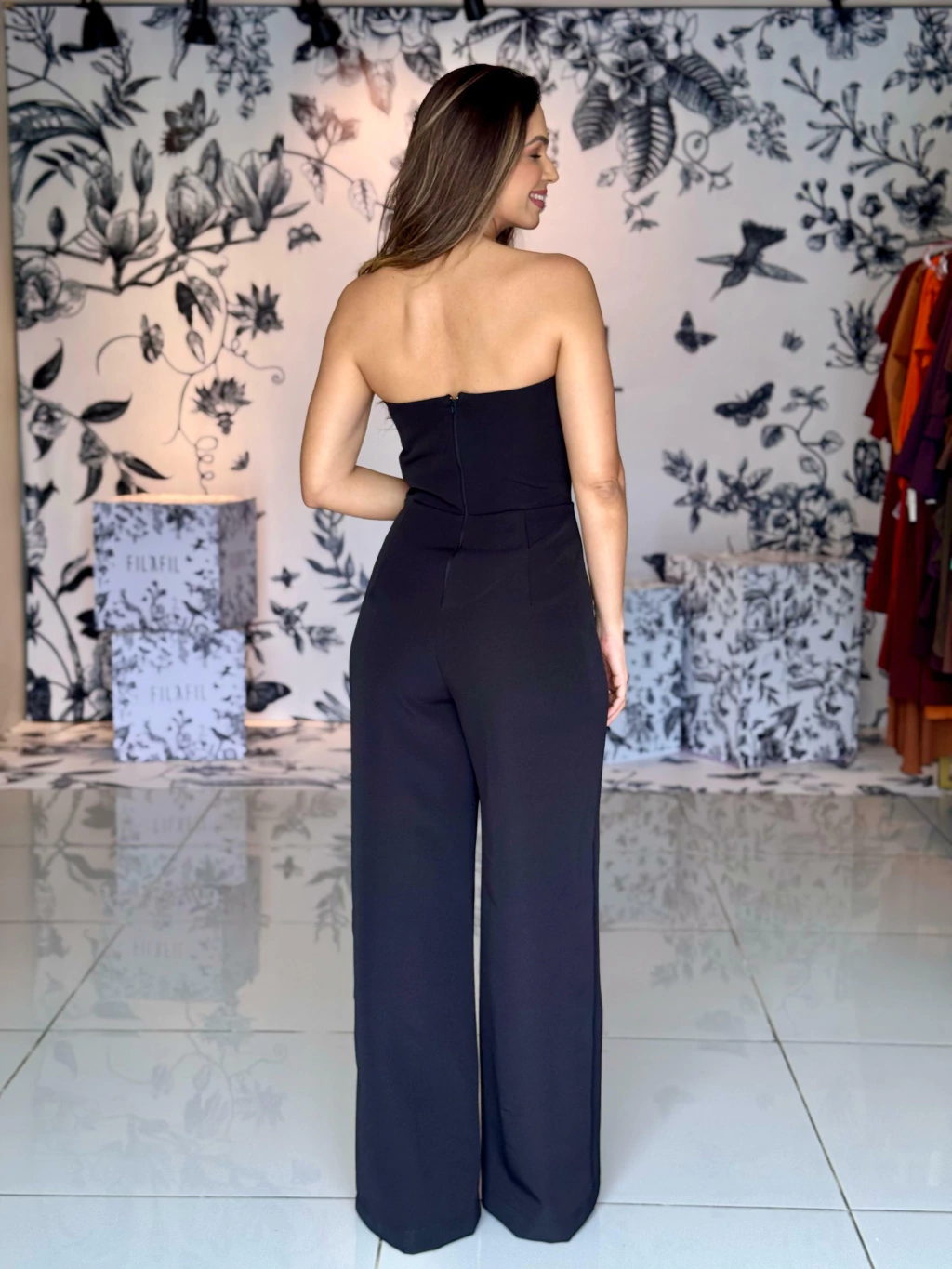 Macacão pantalona com decote tomara que caia e aplicação dourada no busto.